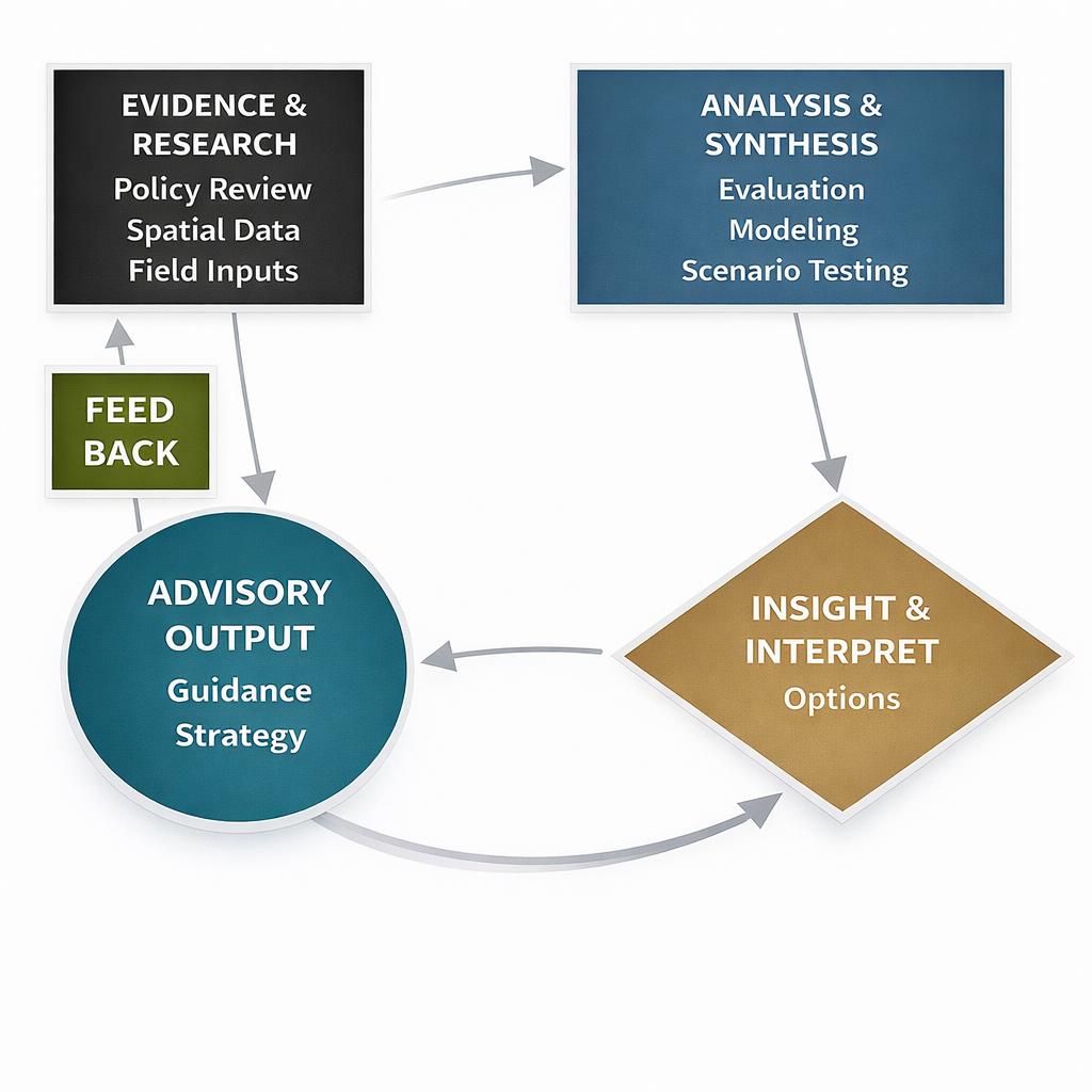 Illustrative representation of evidence-led analysis, interpretive insight, and feedback-driven advisory processes